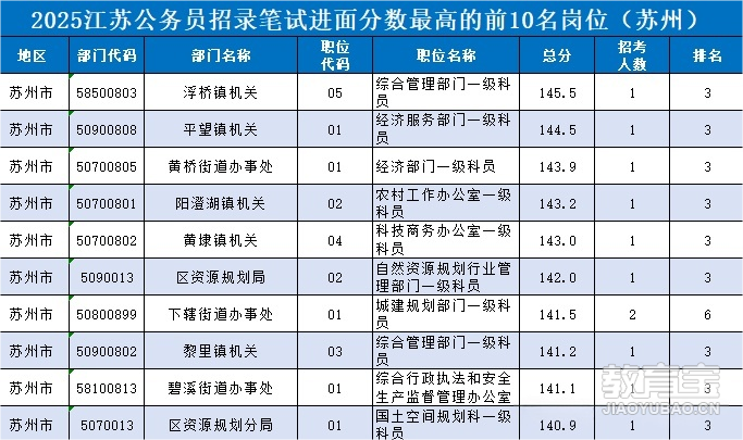 第3名:黄桥街道办事处,经济部门一级科员,143.9分;