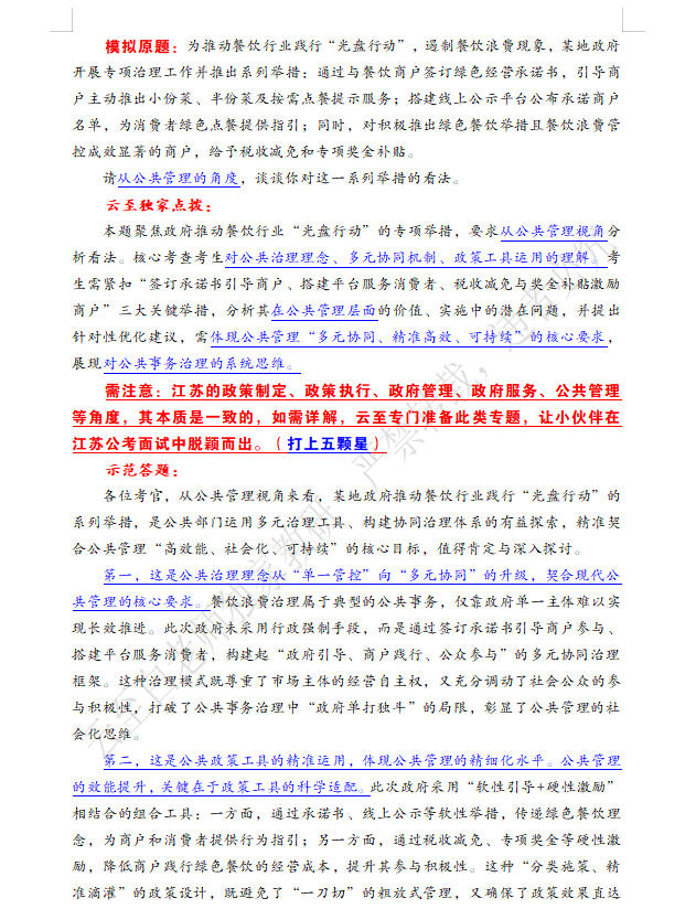 这是一道非常典型的自带角度的综合分析题。这种题目在江苏省考结构化面试很常见,它看似是一道政府公共行为的综合分析题,但是如果考生按照一般的政府公共行为题的思路来作答,就是严重偏题,需结合政策制定、公共管理、政府管理等角度进行作答才是面试高分的关键,关于类似的题目我们在2025年江苏省考面试冲刺班最后训练全真模拟练习过。