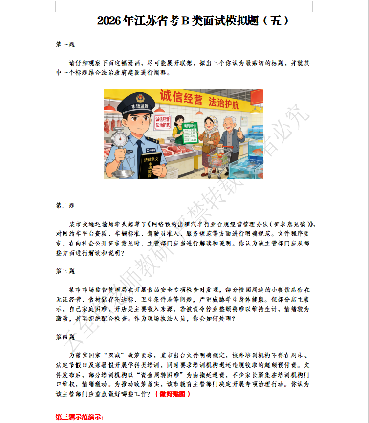 本题属于应急应变+执法服务复合题型,聚焦基层市场监管执法的典型场景,核心考查三个能力:一是应急处置能力,能否快速安抚店主情绪、化解现场对立;二是依法行政能力,能否兼顾食品安全底线与民生温度;三是解决问题能力,能否给出“关停整改+帮扶纾困”的两全方案,贴合江苏面试“务实、接地气”的命题风格。