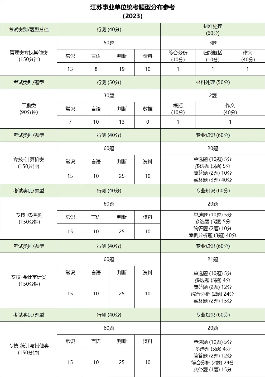 江苏事业单位笔试统一考查《综合知识和能力素质》,按岗位类型分为三类试卷: